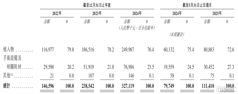 按业务线来看,2022年至2025年1-5月,天星医疗来自植入物的收入占比由79.8%下降至72.6%。