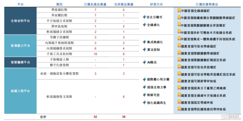 目前,公司已获批的产品有52款。其中,第三类医疗器械20款,5款产品在中国市场上所有品牌中首个获批并应用于临床,10款产品在国产品牌中首个获批并应用于临床。
