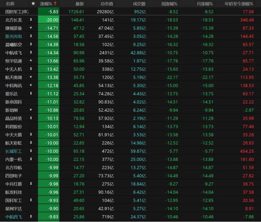国防军工板块今日出现深度调整,低开低走,下挫近6%。在138只个股中,华丰科技微涨,其余均飘绿。其中,82只相关个股跌幅超过5%,长城军工等10只个股跌停,北方长龙更是“20cm”跌停。