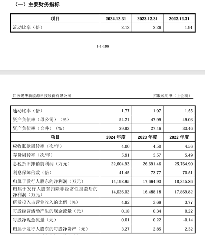 不仅如此,锡华科技的财务健康状况良好,公司近年保持稳健的资本结构,流动资产与负债比例处于合理区间,资产负债率持续优化。2022年至2024年,其流动比率分别为1.91、2.26和2.13,速动比率分别为1.55、1.97和1.77。公司合并资产负债率分别为33.46%、27.46%和29.83%,整体呈现下降态势,财务风险相对较低。而且应收账款与存货的周转率也都高于同行可比公司水平。如报告期内,同行可比公司应收账款周转率的平均值分别为3.70、3.44、3.61(次/年),锡华科技分别为4.56、4.50、4.00(次/年);又比如存货周转率同行可比公司平均值分别为4.46、3.66、3.24(次/年),而锡华科技分别为5.49、5.57、5.91(次/年)。