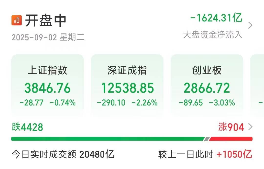 【大河财立方消息】9月2日午后,A股三大指数持续走弱,截至发稿,沪指跌0.74%,深证成指跌2.26%。创业板指跌3.03%。沪深北三市实时成交额2.05万亿元,连续15个交易日突破2万亿,较上一个交易日放量1050亿元。