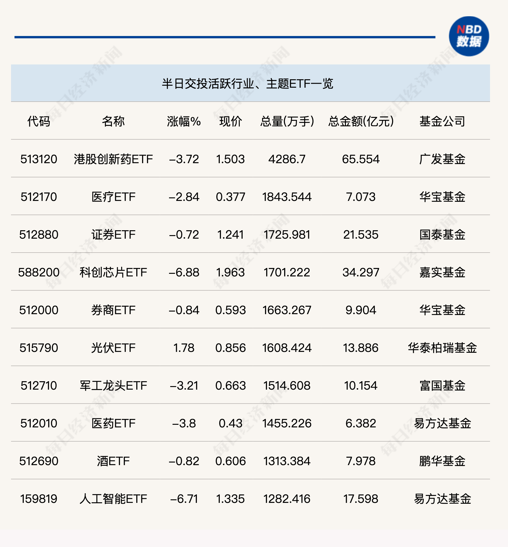 今日上午两市热门板块陷入调整,低位板块反弹强劲。港股创新药ETF依旧是行业ETF“吸金”主要产品,半日成交量达到4287万手,成交金额为65.55亿元;此外,证券ETF、科创芯片ETF半日成交也均在20亿元以上,交投活跃。