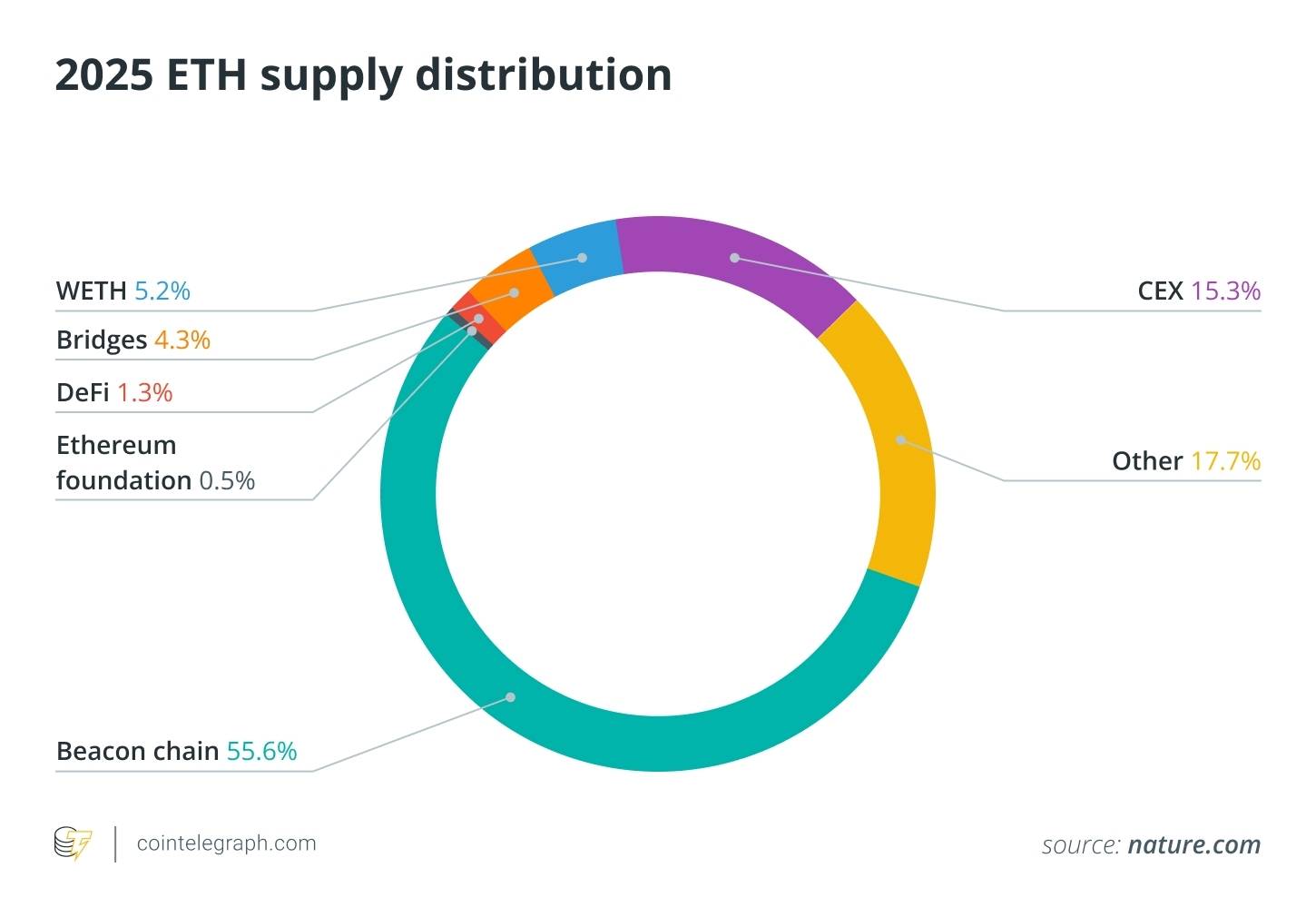 截至2025年年中,以太币流通总量约为1.2071亿枚。5月Pectra升级后,ETH发行量实现净增为零。了解以太币持有分布需以此为背景。