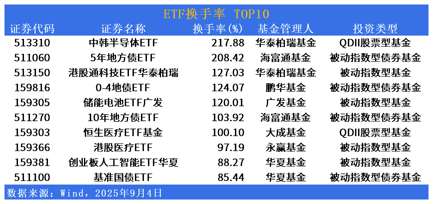 换手率方面,中韩半导体ETF(513310)换手率居首,达217%。5年地方债ETF(511060)、港股通科技ETF华泰柏瑞(513150)、0-4地债ETF(159816)换手率居前。