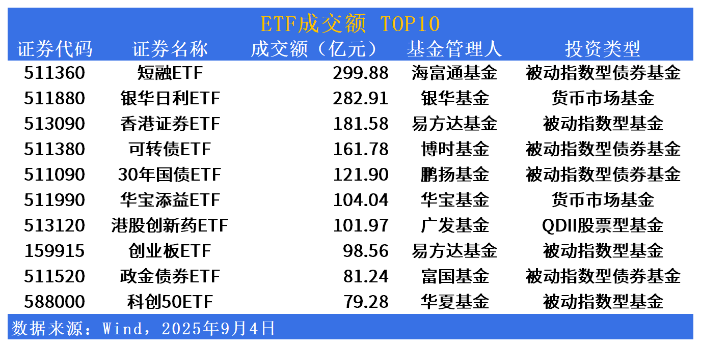 成交额方面,短融ETF(511360)今日成交额居首,达299亿元。银华日利ETF(511880)、香港证券ETF(513090)、可转债ETF(511380)成交额居前。