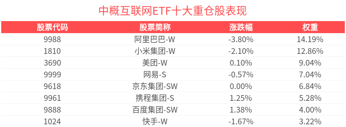 数据显示,截至2025年8月29日,中证海外中国互联网30美元指数前十大权重股分别为腾讯控股、阿里巴巴-W、小米集团-W、拼多多、美团-W、网易-S、携程集团-S、京东集团-SW、百度集团-SW、快手-W,前十大权重股合计占比85.54%。