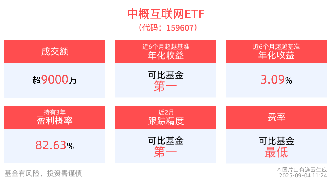 流动性方面,中概互联网ETF盘中换手8.89%,成交9316.17万元。拉长时间看,截至9月3日,中概互联网ETF近1年日均成交3.64亿元。规模方面,中概互联网ETF最新规模达10.51亿元。