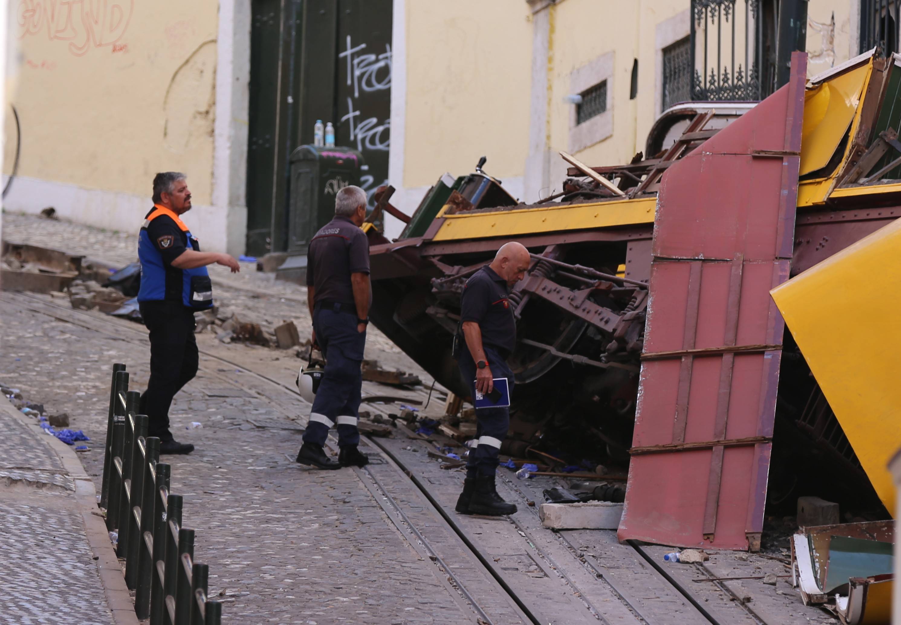 9月4日,工作人员查看里斯本有轨升降缆车事故现场。 新华社记者 荀伟 摄