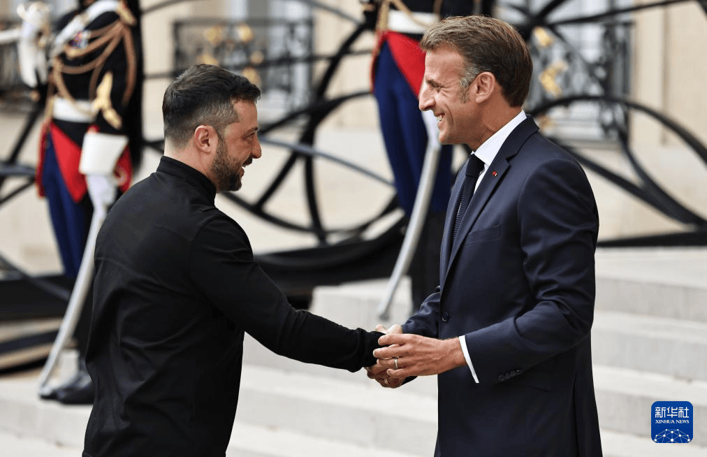 9月4日,在法国首都巴黎的总统府爱丽舍宫,法国总统马克龙(右)迎接出席“志愿联盟”线上会议的乌克兰总统泽连斯基。新华社记者高静 摄
