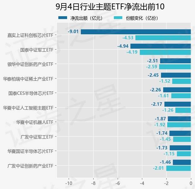 当日有177只行业主题ETF基金出现资金净流出,其中净流出排首位的是嘉实上证科创板芯片ETF(588200),份额减少了4.53亿份,净流出额为9.01亿元。
