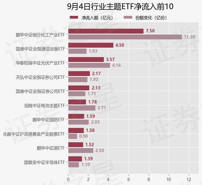 当日有94只行业主题ETF基金出现资金净流入,其中净流入排首位的是鹏华中证细分化工产业ETF(159870),份额增加了11.29亿份,净流入额为7.5亿元。