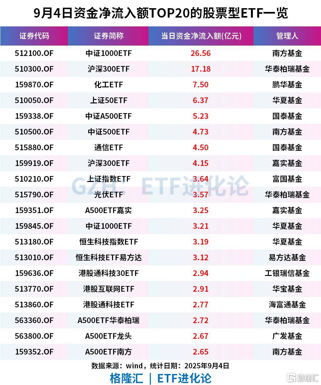 昨日,中证1000ETF吸金26.56亿元,沪深300ETF净流入17.18亿元;化工ETF、上证50ETF、中证A500ETF净流入超5亿元。