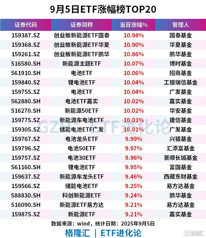 全市场超4800股飘红,涨停个股105家。新能源、电池领涨,相关ETF霸屏今日涨幅榜。