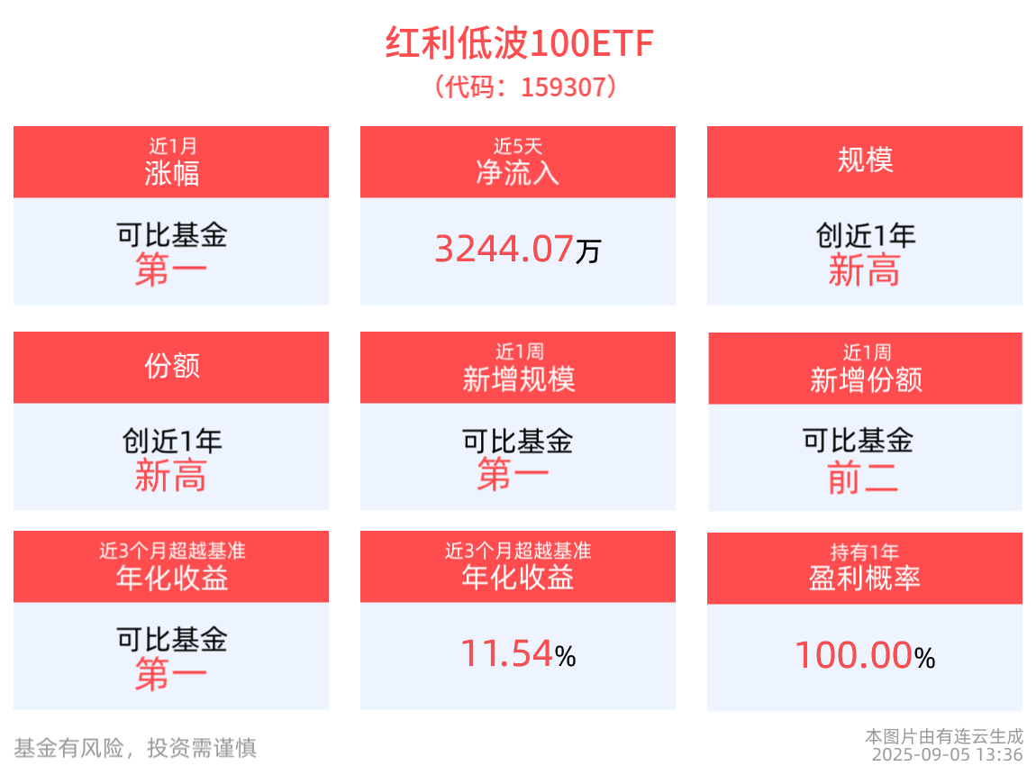 规模方面,红利低波100ETF最新规模达12.77亿元,创近1年新高。
