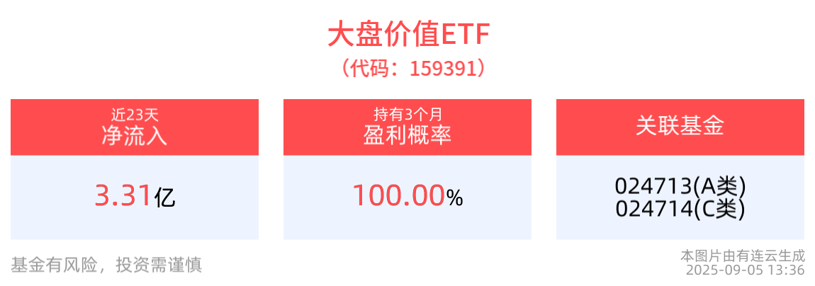 资金流入方面,大盘价值ETF最新资金净流出440.39万元。拉长时间看,近23个交易日内,合计“吸金”3.31亿元。