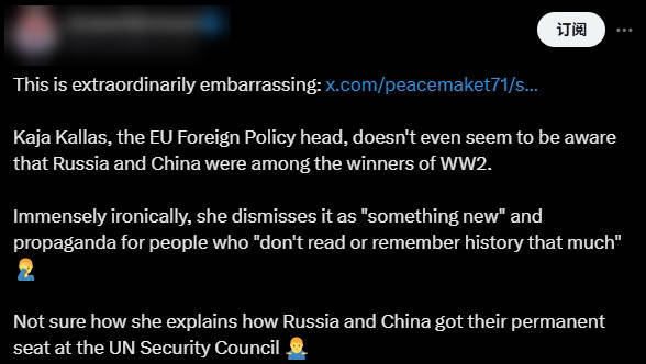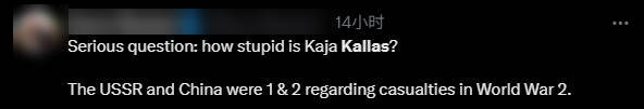 “这真是太尴尬了,”有网民写道,“卡拉斯似乎甚至没有意识到俄罗斯和中国是二战的胜利者之一……实在搞不清楚她如何解释中俄是联合国安理会常任理事国。”
