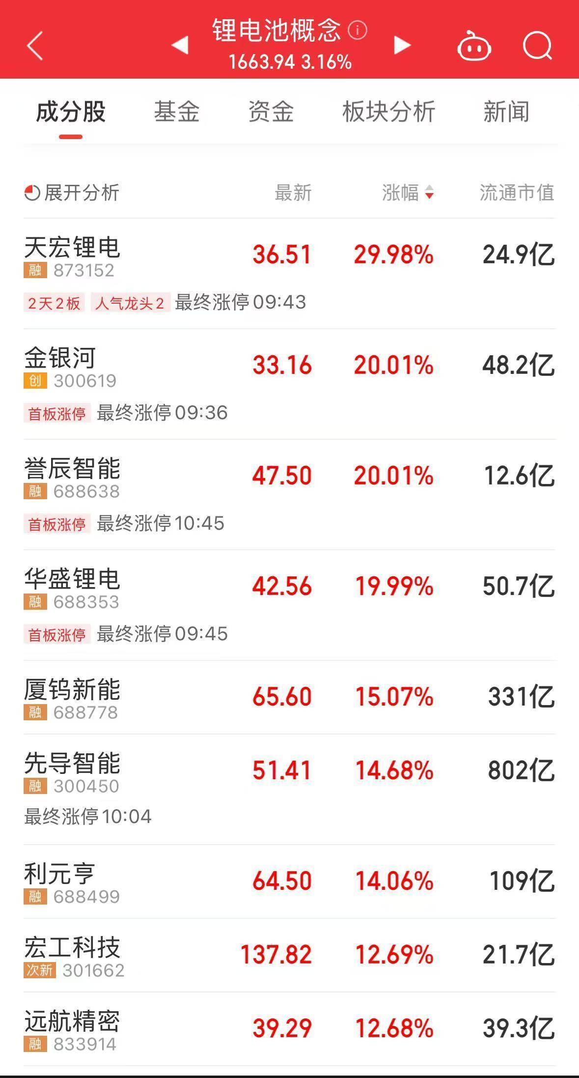 锂电板块持续走强,天宏锂电30%涨停,光华科技、多氟多、天际股份等多股涨停。