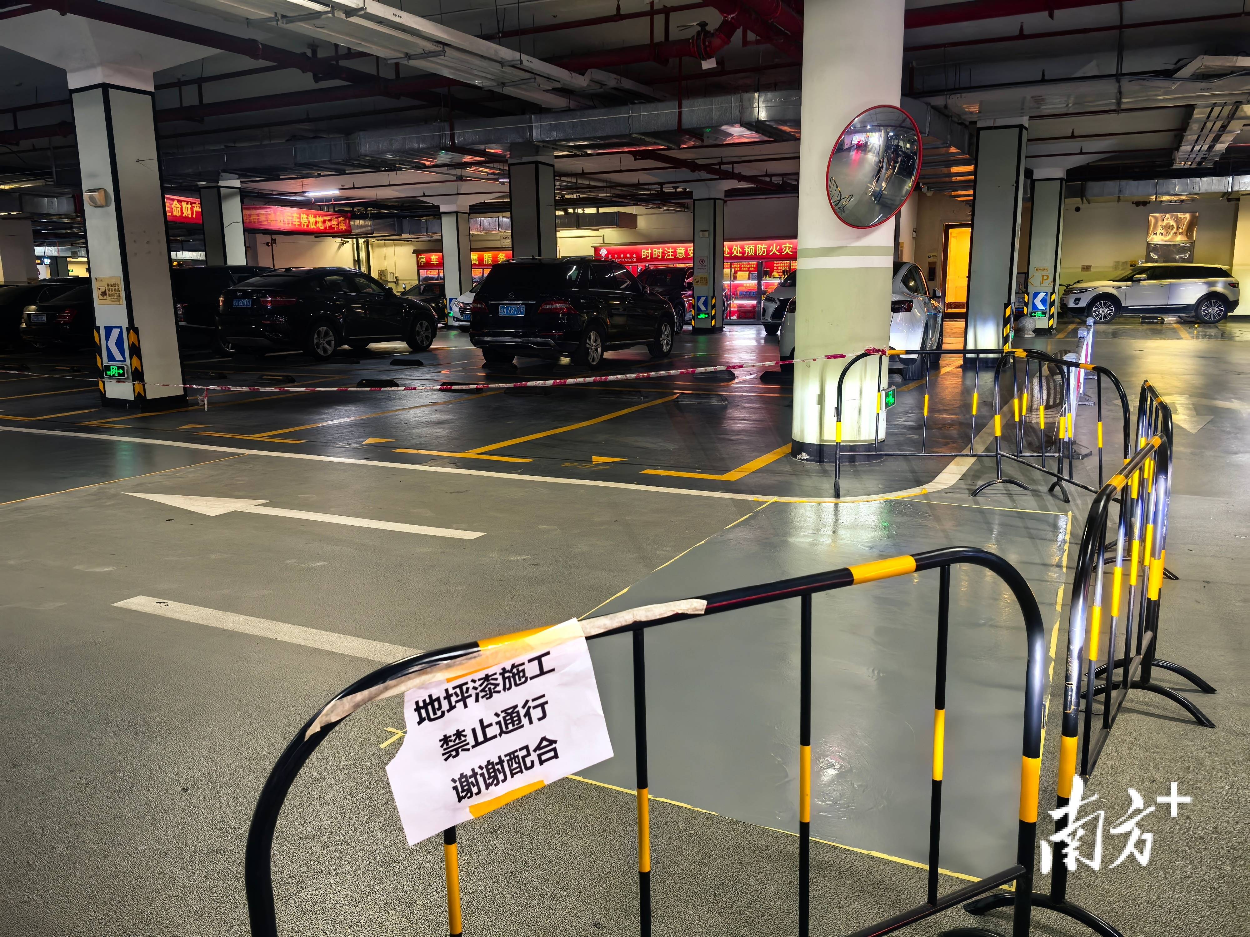 在三号园的地下车库,记者看到中间相当一部分已经被围蔽,围栏上说地坪漆施工,禁止通行。黄先生说,他们早不施工晚不施工,偏偏这时施工,而且在一夜之间把所有原来业主的固定停车位牌全部摘了,搞得现在都乱了套,有的已经买了车位的业主被原来在此车位的固定租户拦住走不了,天天都有人在车库吵架。