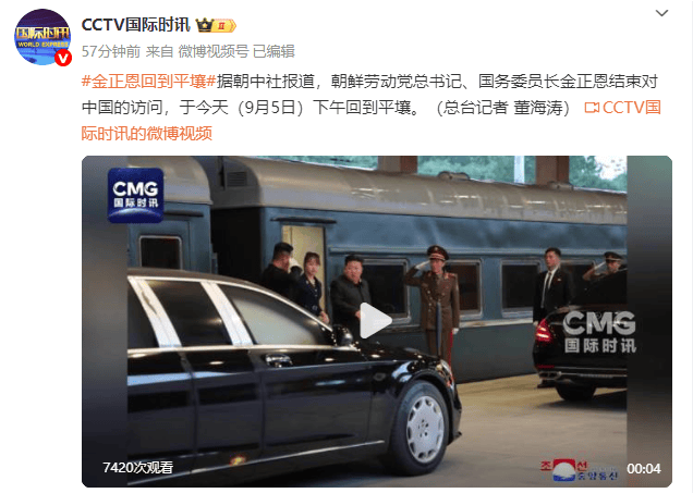 据朝中社报道,朝鲜劳动党总书记、国务委员长金正恩结束对中国的访问,于今天(9月5日)下午回到平壤。(总台记者 董海涛)