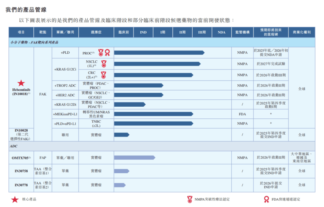 目前该公司正有多条产品管线在推进。据招股书,截至最后实际可行日期,应世生物的产品管线包括一款核心产品ifebemtinib(一种接近商业化的高选择性FAK抑制剂),一款第二代选择性FAK抑制剂IN10028,以及三种创新候选抗体偶联药物 (OMTX705、IN30758、IN30778)。