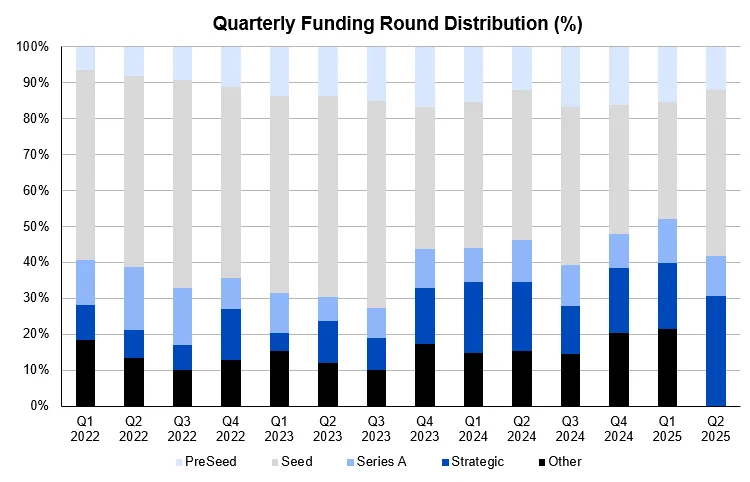 首先,投资轮次的偏好开始从早期轮次向后期项目倾斜。2025 年 Q1,早期融资轮次占比首次跌破 50%,这是自 2022 年以来的首次拐点。该变化表明:在退出路径愈发不确定、头部项目占据资源的大环境下,机构对“确定性”的偏好显著上升,更倾向投向已有产品验证、收入来源清晰的成熟项目。与此同时,PreSeed 和 Seed 阶段的融资笔数占比有所下降,尽管整体仍维持在相对健康区间,显示早期创业活力仍在,但募资门槛显著提高。