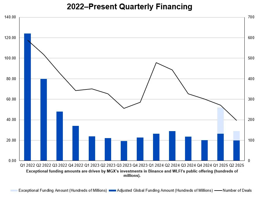 ArkStream Capital 作为一级市场的长期参与者,我们观察到:自 2022 年峰值以来,市场经历了剧烈的资本收缩与融资活动降温,并在 2023 年触及低点。虽然 2025 年 Q1 的整体融资规模有所回升,但增量主要集中于少数超大额融资事件,剔除这些异常个案后,市场活跃度仍然低迷。