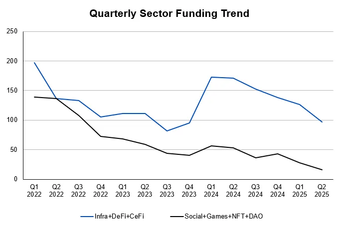 一级市场的投融资数据是衡量市场是否愿意为创新想法买单的标准,投融资数据越高,意味着更多风险资金愿意押注这个行业未来的发展。无论是去中心化金融( DeFi )上的可组合性乐高,还是倡导着数据“可读,可写,可拥有”的 Web3 愿景,以及从隐私保护、分布式存储、可拓展性去不断精进的基础设施,都依托于风险资金对这个市场的持续下注。与风险资金伴生的是人才的涌入,一级市场的繁荣,很多时候也体现在源源不断在这个行业进行创新创业的人才上。这一数据在 2022 年 Q1 达到高峰,单季融资金额高达 124 亿美元,融资笔数达 588 起。然而,自此之后,市场急转直下,进入持续下行周期,融资总额与活跃度双双滑落。至 2023 年 Q4 ,季度融资额跌至 19 亿美元,融资笔数降至 255 起,触及周期底部。尽管 2024 年略有反弹,整体市场依然维持在低位运行。2025 年第一季度的融资数据表面上出现回暖迹象:季度融资总额回升至 52 亿美元,融资笔数增长至 271 起。但这轮“复苏”难以经受细致拆解。该季度中,阿布扎比主权基金 MGX 对 Binance 的战略投资(约 20 亿美元)占据了超过 40% 的总额,是单一事件驱动的异常值。此外,World Liberty Financial 的 5.5 亿美元 ICO 也显著抬高了整体数据。若将上述超大额融资剔除,一季度加密原生项目的实际融资规模仅为约 26.5 亿美元。进入 2025 年第二季度,下跌现象依然延续。例如 SharpLink、BitMine、Digital Asset 和 World Liberty Financial 等项目的融资需单独处理,不应视为加密风险投资市场的常态。可以看到,从 2025 年 Q1 开始,加密原生风投资金和传统金融的资金出现了明显的分歧,加密原生风投资金持续收缩,而传统金融资金跑步进场,在股权市场大施拳脚。看似增长的背后,是资本正加速向低风险偏好项目集中,市场整体的风险投资活动并未真正复苏。