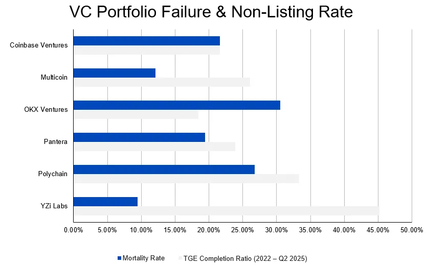 项目数据说明:本分析以欧美及交易所的顶级加密 VC 投资为样本,涉及机构包括 Coinbase Ventures、Multicoin Capital、YZi Labs、OKX Ventures、Polychain Capital 及 Pantera Capital。(源数据详见附录表格 VC Portfolio Failure & Non-Listing Rate )