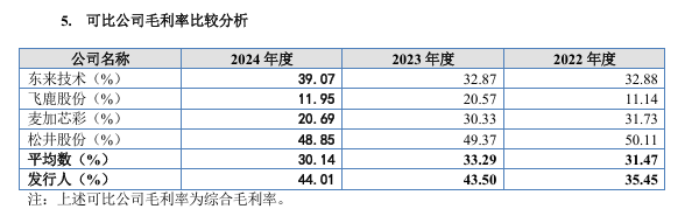 此外,雅图高新业绩优秀令人怀疑是否有幸运之神的关照。报告期,雅图高新的营业收入分别为5.57亿元、6.36亿元、7.42亿元,净利润分别为7826.15万元、1.17亿元、1.49亿元,营收与净利润双双稳步增长。更重要的是,该公司的毛利率也稳步走高,报告期分别为35.45%、43.50%、44.01%,明显高于同行可比公司水平。