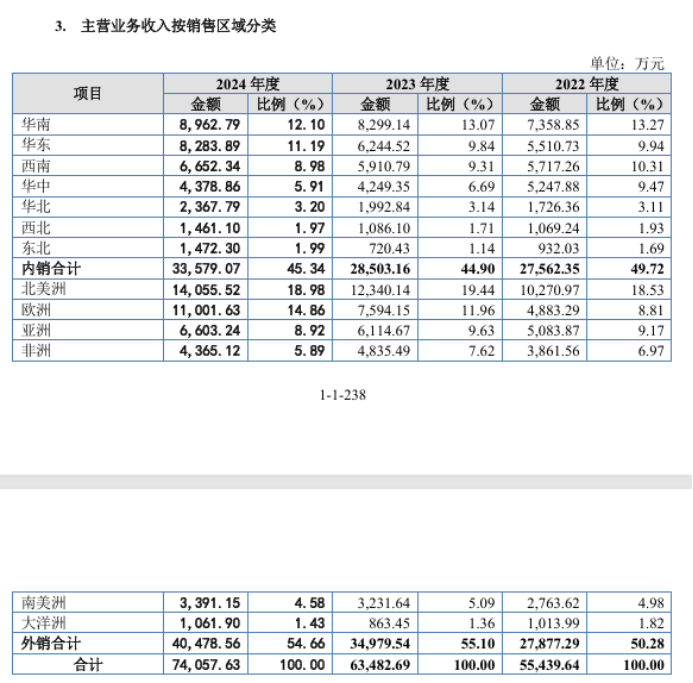 尤其重要的是,在雅图高新的营收中,外销超过了内销。报告期三年内销收入分别为27562.35万元(占比49.72%)、28503.16万元(占比44.90%)、33579.07万元(占比45.34%);而报告期三年外销收入分别为27877.29万元(占比50.28%)、34979.54万元(占比55.1%)、40478.56万元(占比54.66%)。