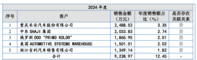 而从该公司前五大客户的销售占比来看,2024年最大的客户重庆长安汽车股份有限公司在该公司销售中的占比也只有3.35%的比例,前五大客户销售的总占比也只有12.45%,该公司客户的分散由此可见。