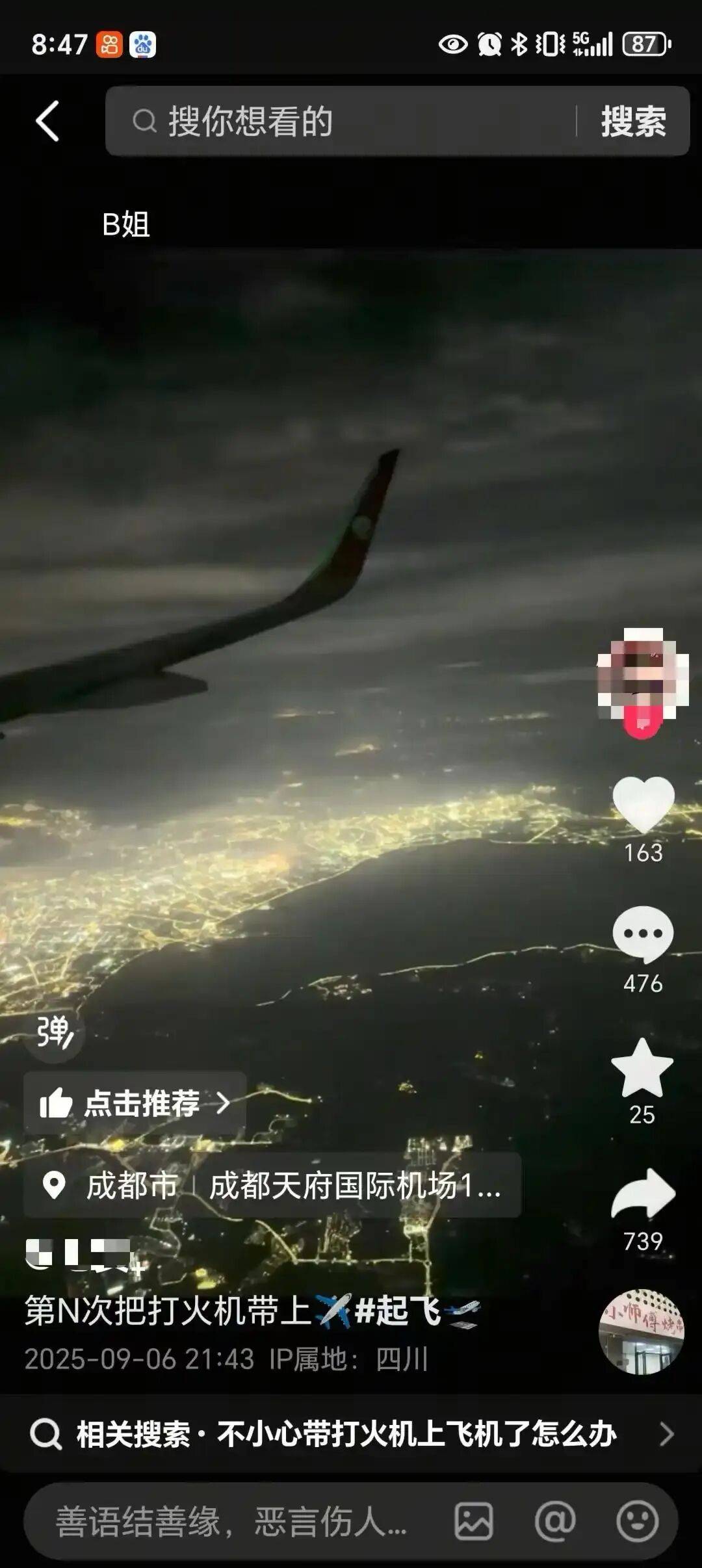 9月6日晚9时43分,一位女乘客发布疑似客舱内的自拍视频,炫耀把打火机带上飞机。现场视频显示,这名乘客坐在紧邻舷窗的位置,其放下座椅折叠板,疑似从小挎包内拿出一枚打火机点燃,透过舷窗可以看到机翼和机场夜景。记者看到,从账号定位显示是在成都天府国际机场。这位乘客称,是从天府国际机场登机起飞,“第N次把打火机带上飞机。” 目前,记者发现她已删除了相关视频。