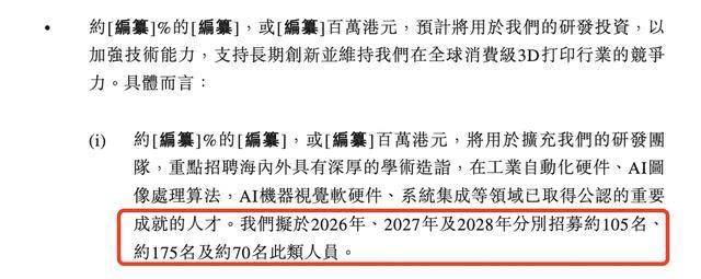 根据创想三维的规划,公司募资将用于扩充研发团队,重点招聘海内外具有深厚的学术造诣,在工业自动化硬件、AI图像处理算法,AI机器视觉软硬件、系统集成等领域已取得公认的重要成就的人才。其将于2026年、2027年及2028年分别再招募约105名、175名、70名研发人才,共计350位研发人才。