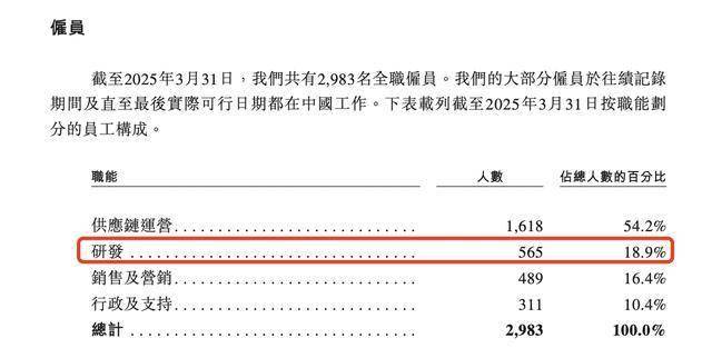 截至2025年3月31日,创想三维的研发团队由565名研发人员组成,占员工总数的18.9%。
