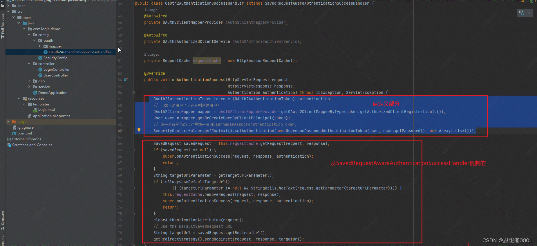 可发现该认证结果包含了大量gitee用户信息,这和密码登录后认证为本地用户是不同的,本地用户可能有id等信息,gitee的id和本地用户的id不同;因此如果Controller中获取该Authentication对象后还需要做转换以匹配本地用户,这是不方便的,因此可以自定义认证成功后处理器中完成用户匹配: