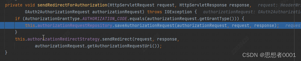 首先执行saveAuthorizationRequest方法,即保存本次请求相关的信息,以用于三方平台回调时可以再次获取,例如当回调时需要检查state参数是否一致,以保证安全;