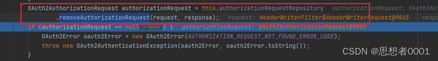 在removeAuthorizationRequest方法中根据state参数从会话中查询授权登录之前保存的请求对象(请求对象也有state参数),如果找不到则抛出异常:AUTHORIZATION_REQUEST_NOT_FOUND_ERROR_CODE