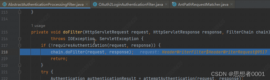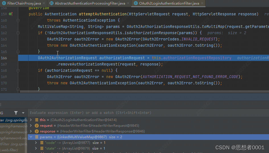 当前请求是/login/oauth2/code/gitee,就是gitee回调请求,debug放行进入OAuth2LoginAuthenticationFilter: